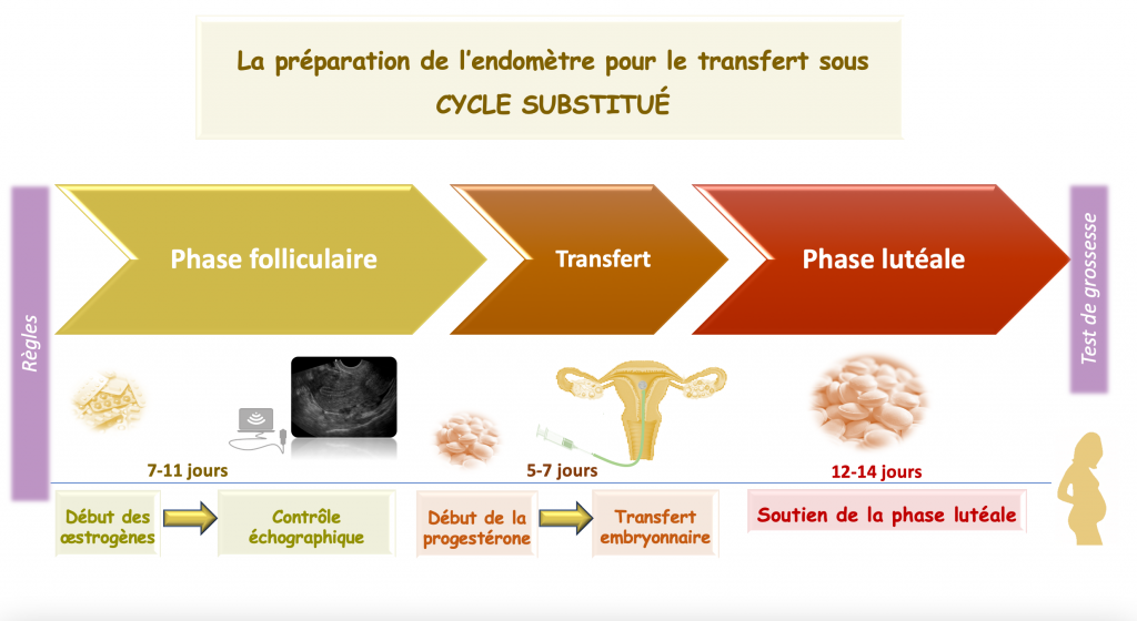 Dans le cycle artificiel ou substitué, les œstrogènes sont administrés dès le début du cycle et la croissance de l’endomètre est surveillée. Une fois l’épaisseur endométriale dépasse les 6-7 mm, le traitement par progestérone est démarré et 3 ou 5 jours plus tard, le transfert d’embryon est effectué.