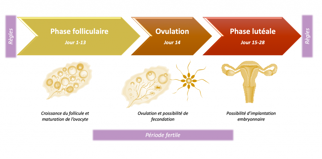 Le cycle menstruel est divisé en deux parties fondamentales, qui durent environ 14 jours, si l’on parle de cycles réguliers de 28 jours. La première partie est la phase dite folliculaire, lorsque les ovaires se préparent à l’ovulation. Pendant cette période, l’ovule est formé et mûri et il sera expulsé du follicule qui le contient vers le 14e jour du cycle. Cette partie du cycle est d’une durée variable selon fonctionnement des ovaires de chaque femme. La deuxième partie du cycle est la phase dite lutéale et c’est le moment dont l’utérus se prépare à recevoir l’éventuel embryon qui a été généré après l’ovulation et fécondation. Cette deuxième phase est de durée constante, toujours 14 jours dans tous les types de cycles.